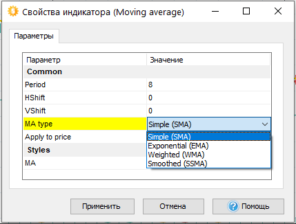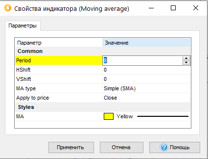 Для того, чтобы изменить параметры индикатора, Вам нужно дважды кликнуть левой кнопкой мыши и нажать «Применить». Некоторые свойства могут иметь выпадающий список или диалоговое окно, где Вы можете выбрать некоторые значения: