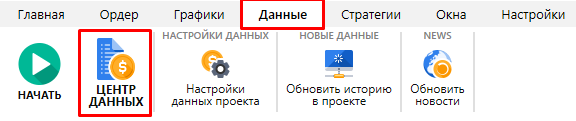 Чтобы открыть диалоговое окно Центр Данных, нажмите соответствующую кнопку на вкладке Данные.