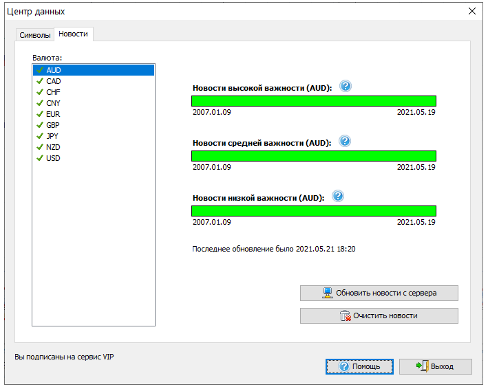 На этой вкладке Вы найдете информацию по доступным историческим новостям, сможете скачать их вручную или перейти по ссылке для обновления вашей подписки (больше об исторических новостях).
