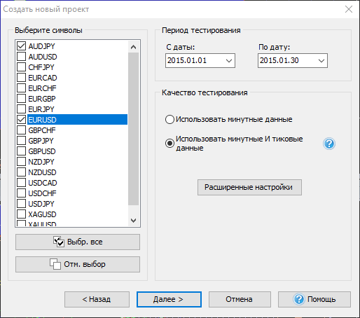 Выберите опцию “Использовать минутные данные”, если у Вас имеются минутные данные, или “Использовать минутные и тиковые данные”, если Вы загрузили тиковые исторические данные с нашего сервера тиковая история данных доступна VIP пользователям).