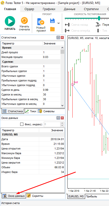 В меню Окно данных слева внизу от графика отображаются дата, время, а также цены закрытия, открытия, максимум и минимум бара, на котором в данный момент расположен курсор мышки. Кроме того, можно увидеть показания объема, индекс бара и показания всех индикаторов.