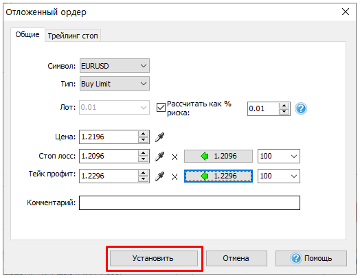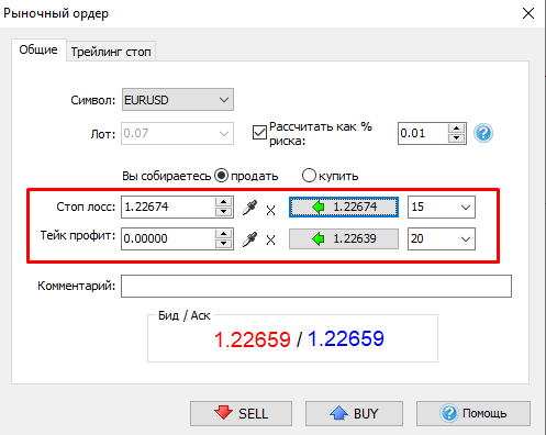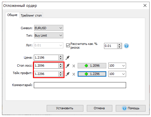 Введите значения Стоп лосс и Тейк Профит.