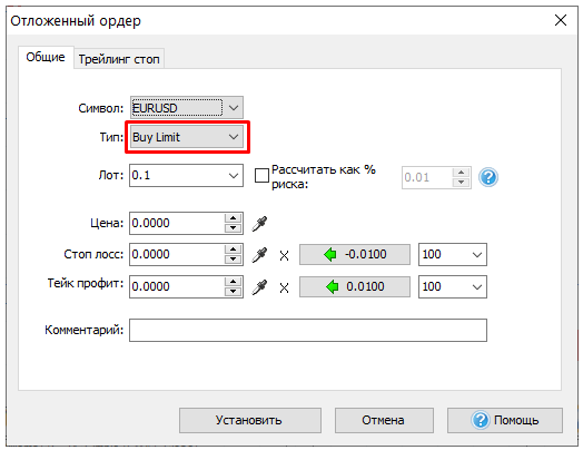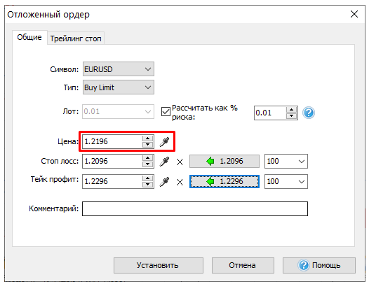 Выберите цену, на которой ордер должен открываться.