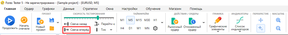 Перемещайтесь на один бар назад при каждом нажатии на клавишу Backspace на клавиатуре или при нажатии на кнопку “Свеча назад” на панели инструментов.