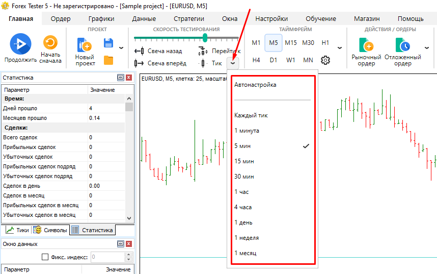Чтобы проанализировать результаты тестирования, перейдите на вкладку Статистика в окне с информацией о рынке, расположенном в верхнем левом углу возле графика.