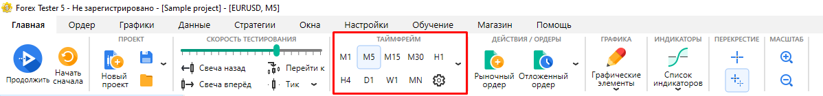 Для изменения таймфрейма используйте соответствующие кнопки на панеле управления или в выпадающем меню справа от них.