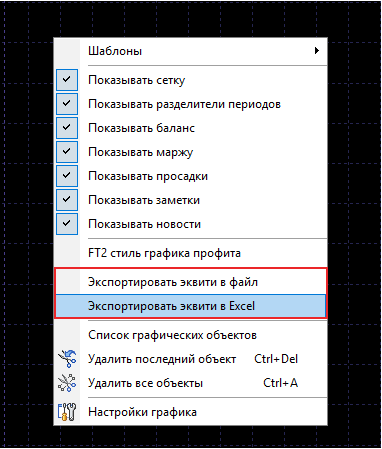 Нажмите правой кнопкой мыши на графике прибыли и выберите подходящий вариант в открывшемся контекстном меню (Экспортировать эквити в файл; Экспортировать эквити в Excel).