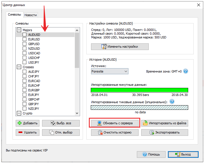 Выделите валютную пару и нажмите кнопку “Обновить с сервера” для загрузки данных с нашего сервера.