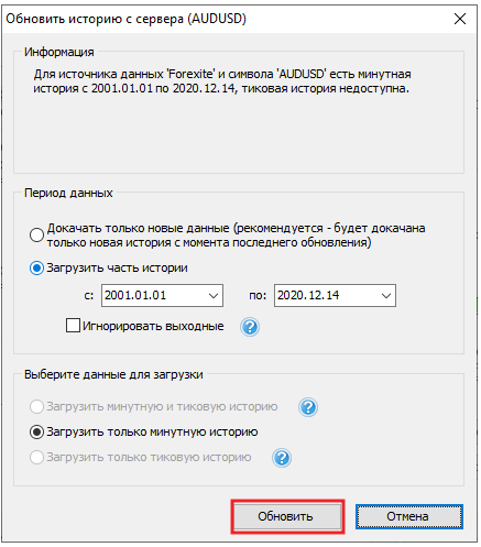 Скачайте новые исторические данные или загрузите данные за определенный период. Нажмите кнопку “Обновить”.