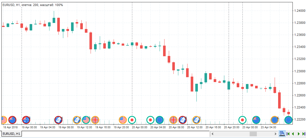 По умолчанию отображение новостей включено, и они показываются внизу графика в виде флагов. Цвет границы (красный, жёлтый, зелёный) указывает на её важность.