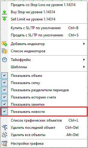 Чтобы отключить отображение новостей, нажмите правой кнопкой мыши на графике и уберите флажок для пункта “Показывать новости”.