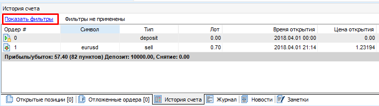 Для удобного просмотра истории счета Вы можете использовать различные фильтры, нажав на кнопку “Показать фильтры”.