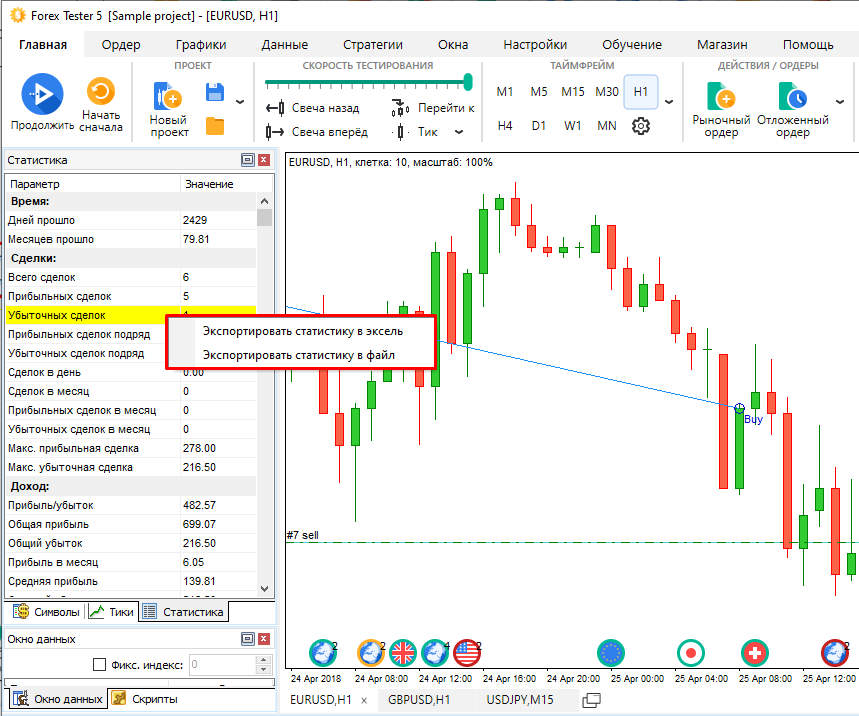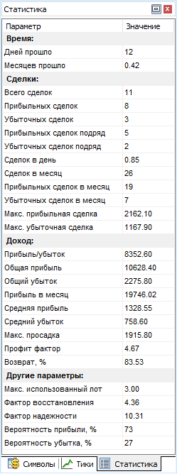 Статистика эффективности стратегии отображается и во время теста, и после того, как тестирование закончено. Окно «Статистика» показывает наиболее важные показатели: