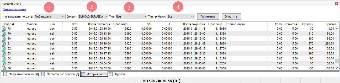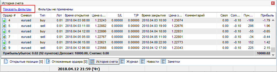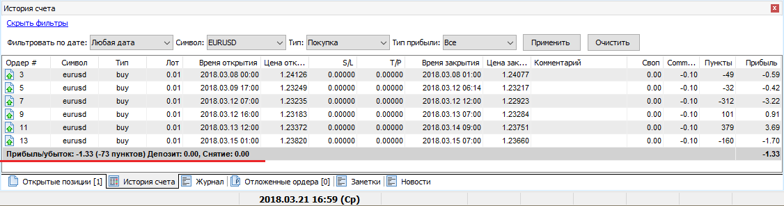 На вкладке «История счёта» Вы можете посмотреть на свою прибыль и убыток в пунктах в строке «Прибыль/убыток».