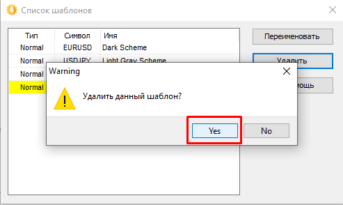 Для удаления шаблона, нажмите кнопку Удалить и подтвердите удаление шаблона: