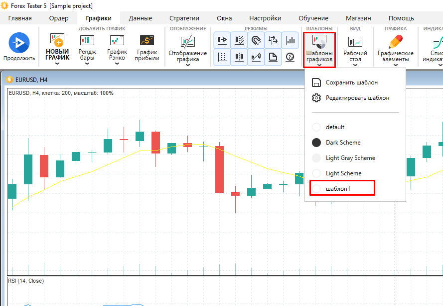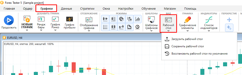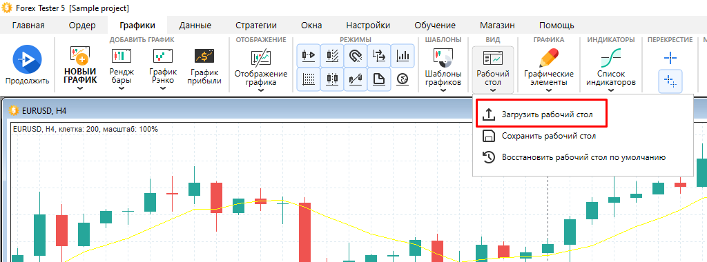 Программа Forex Tester позволяет сохранять набор графиков со всеми индикаторами и графическими инструментами в виде файла и затем загружать этот файл в программу для восстановления нужной конфигурации.