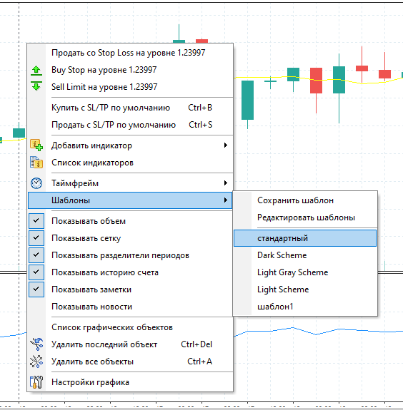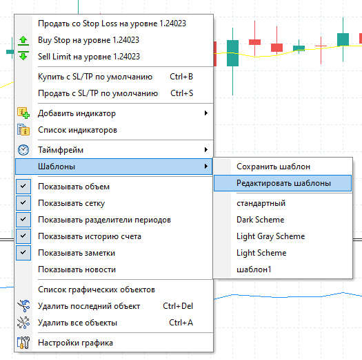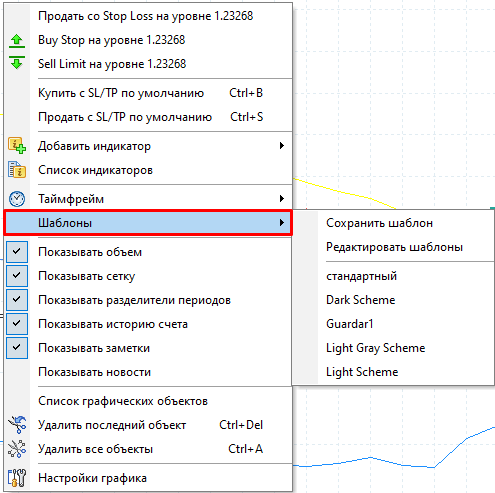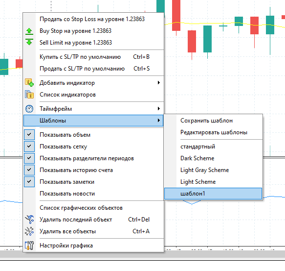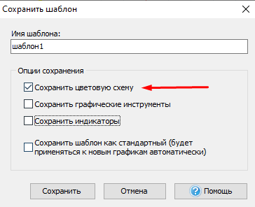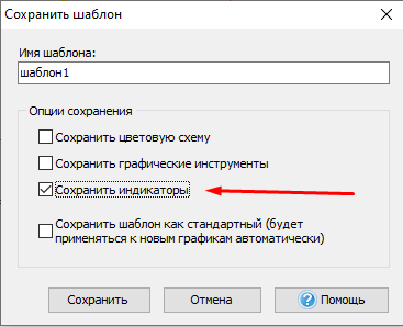 2. Выбрать Шаблоны → Сохранить шаблон, или нажать правой кнопкой мыши на графике и выбрать Шаблоны → Сохранить шаблон: