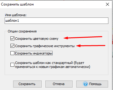 → кроме цветовых схем, также будут сохранены все графические инструменты: линии, инструменты Фибоначчи, фигуры, каналы, метки и т.д.