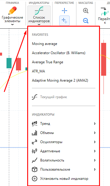 Если вы добавляете свои собственные индикаторы, они попадают в меню «Пользовательские» автоматически.