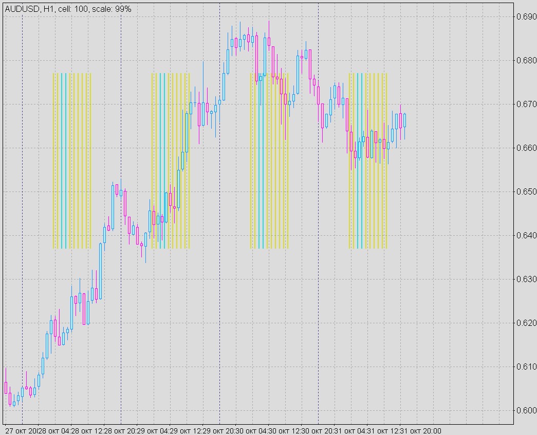 Ха! Только что понял, что вместо цветного прямоугольника проще всего на график выставлять частокол (забор) из нескольких вертикальных трендовых линий повышенной толщины.