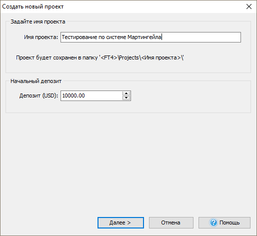 Введите название проекта и укажите начальный депозит в USD, нажмите “Далее”.
