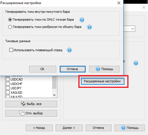 Выберите опцию “Использовать минутные данные”, если у Вас имеются минутные данные, или “Использовать минутные и тиковые данные”, если Вы загрузили тиковые исторические данные с нашего сервера тиковая история данных доступна VIP пользователям).