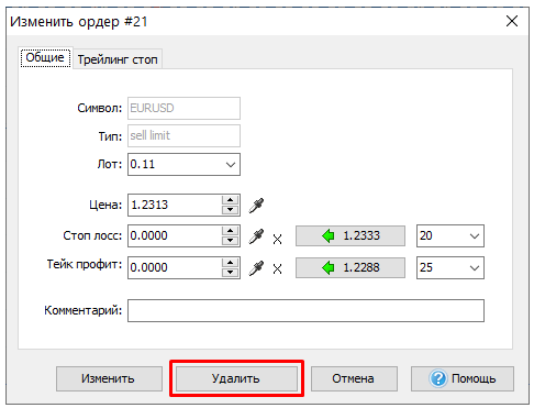 Если отложенный ордер еще не был открыт, он останется на вкладке Отложенные ордера в левом нижнем углу терминала. Чтобы закрыть его вручную, дважды щелкните строку нужного ордера.