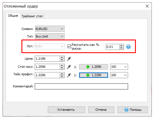 Обратите внимание, что расчет лота на основе риска требует ввода значения Стоп лосса.