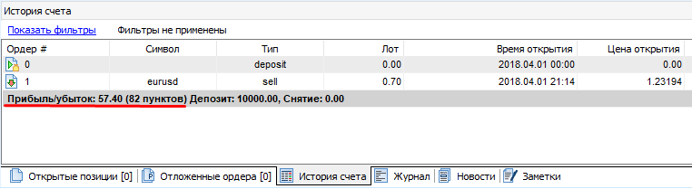 На вкладке История счета Вы можете увидеть свою прибыль и убыток в пунктах.