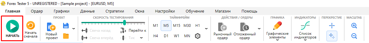 Нажмите кнопку “Начать” на вкладке Главная, чтобы запустить тестирование проекта, выбранного по умолчанию.