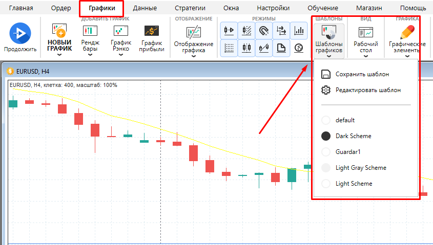 Шаблон - это полностью настроенная конфигурация окна графика, включая индикаторы, инструменты для рисования и графические цветовые схемы.